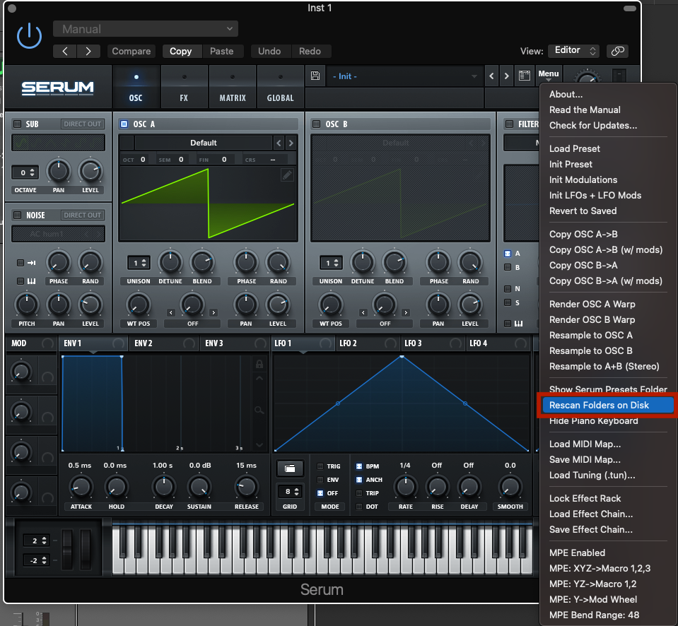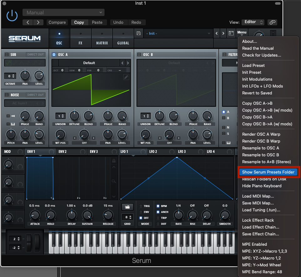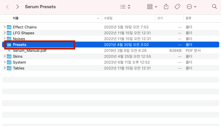 2.Serum을 열고 -> Preset Folder를 열어 프리셋 파일을 드래그 앤 드랍