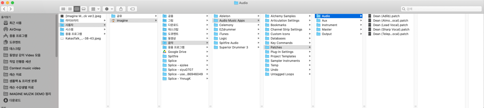 - 다운로드 받으신 체인 폴더를 finder/MacintoshHD/Users/Your Account/Music/Audio Music Apps/patches/Audio 안에 넣습니다.